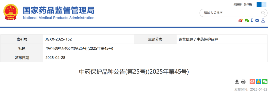 五、中药保护品种公告(第25号)(2025年第45号)