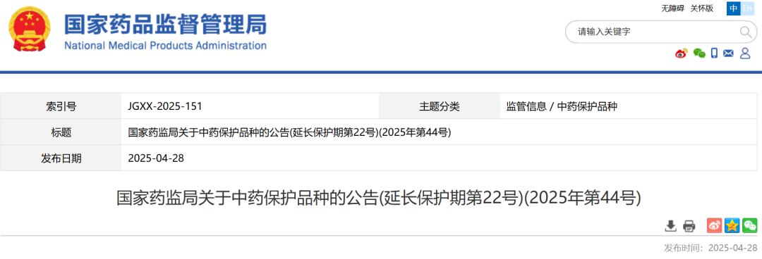 四、国家药监局关于中药保护品种的公告(延长保护期第22号)(2025年第44号)