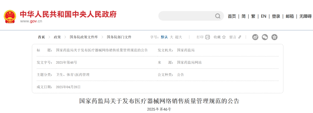为加强医疗器械网络销售监督管理,规范医疗器械网络销售质量管理,保障公众用械安全有效,促进医疗器械产业发展,根据相关法规规章规定,国家药监局制定了《医疗器械网络销售质量管理规范》,现予发布,自2025年10月1日起施行。