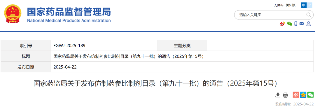 三、国家药监局关于发布仿制药参比制剂目录(第九十一批)的通告(2025年第15号)
