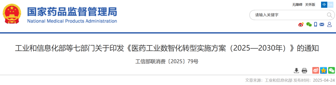 一、工业和信息化部等七部门关于印发《医药工业数智化转型实施方案(2025—2030年)》的通知