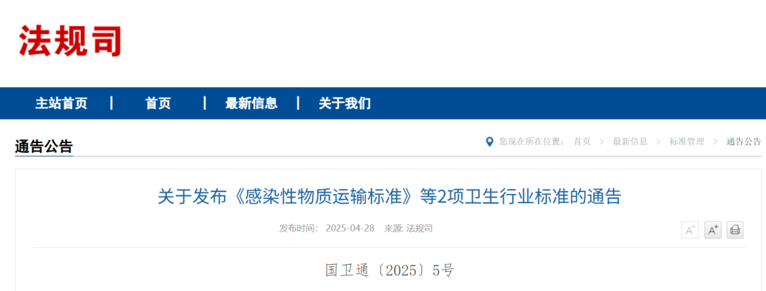 二、关于发布《感染性物质运输标准》等2项卫生行业标准的通告